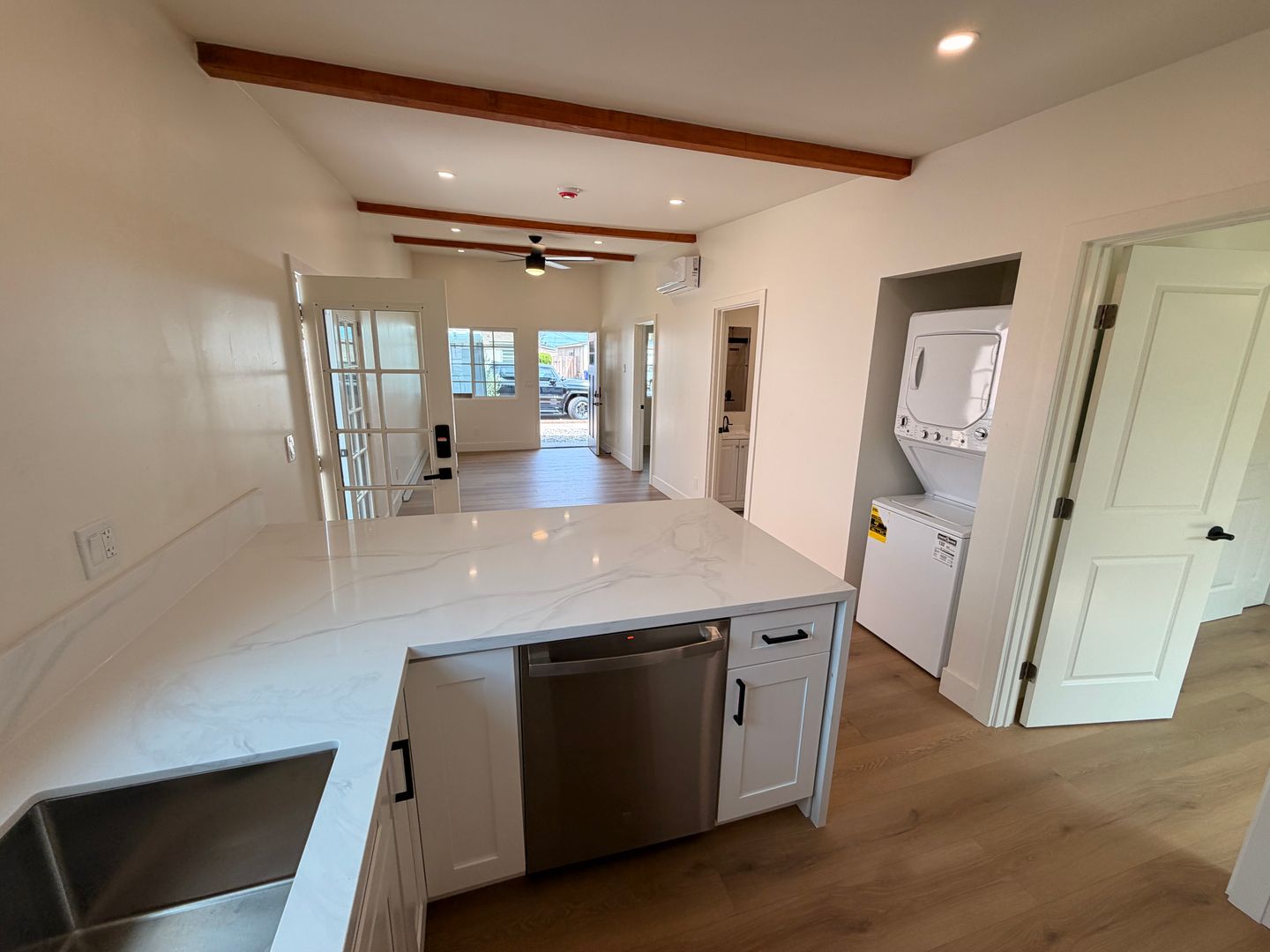 Discover the Brand New full gut remodel in Claiermont: a fully renovated 2-bedroom, 2-bath home, in unit stacked laundry, finished with new flooring, fresh paint, Custom tiles in the showers, waterfall counters, new cabinets, new appliances, new doors, and all-new windows and stucco. Each room includes a new ceiling fan and AC and new blinds. The unit features air conditioning and a fenced patio leading to a yard/courtyard. Conveniently located near shops, schools, and the freeway, this recently remodeled home offers modern finishes and thoughtful updates throughout.